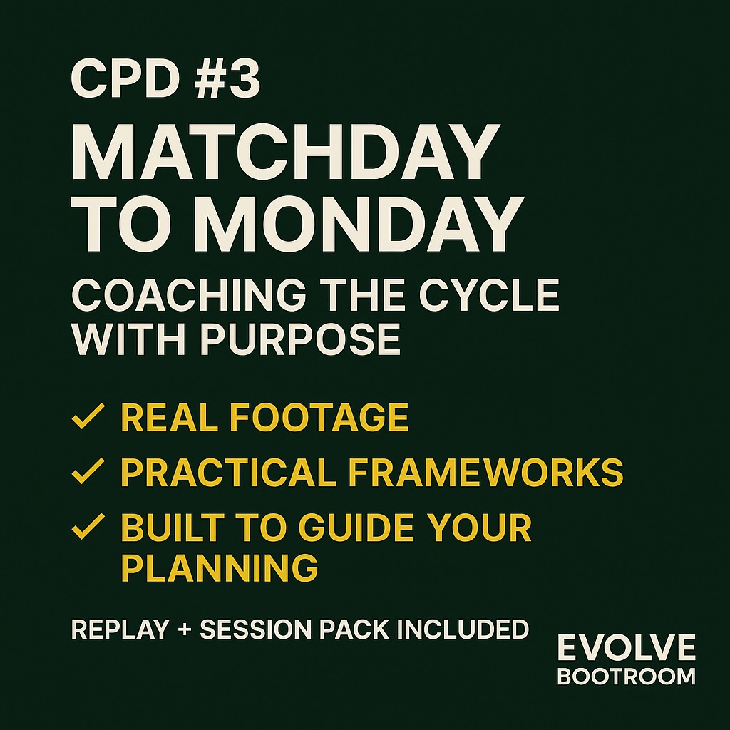 Bootroom CPD #3 – Matchday to Monday🎯 Transform your coaching week with this 1-hour CPD. Learn how to give effective matchday feedback, plan post-match sessions with purpose, and set up a Monday rhythm your team will feel. 📦 Includes Full HD video + PDF slide pack with practical tools, frameworks, and bonus session examples. Instant access available.